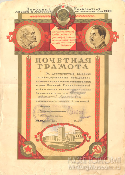 Почётная грамота, Московский Мясокомбинат им. Микояна, 1945 год