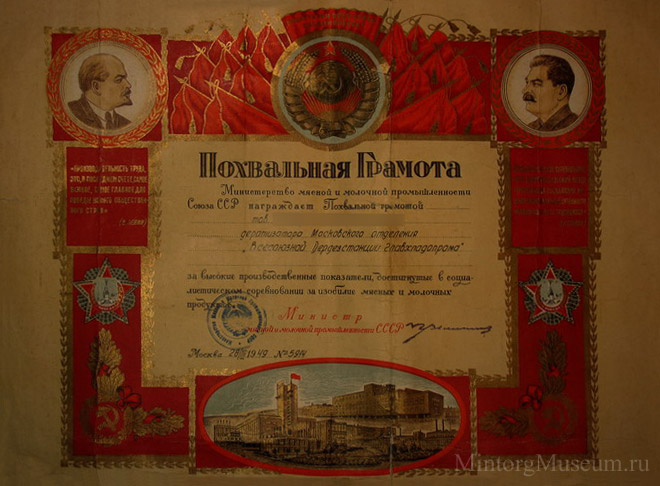 Похвальная грамота Министерства мясной и молочной промышленности СССР, 1949 год