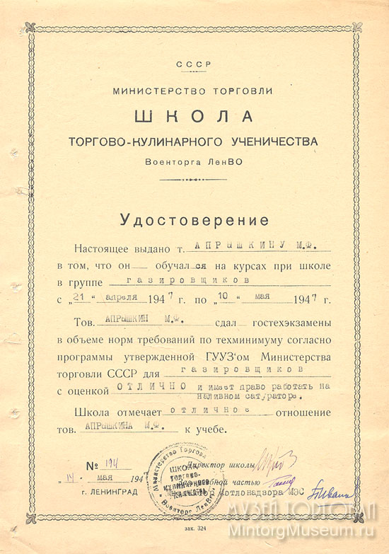 Обучение на курсах Школы торгово-кулинарного ученичества при группе Сатураторщиков.